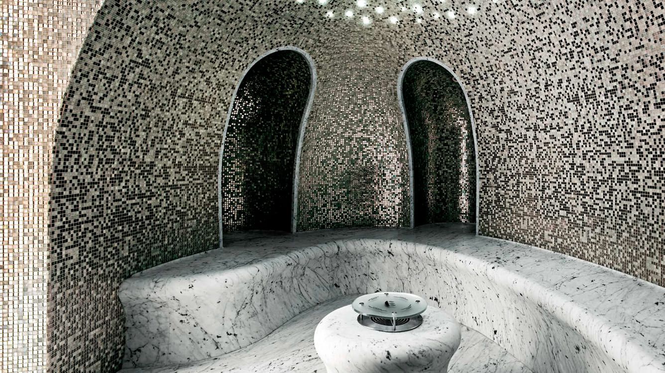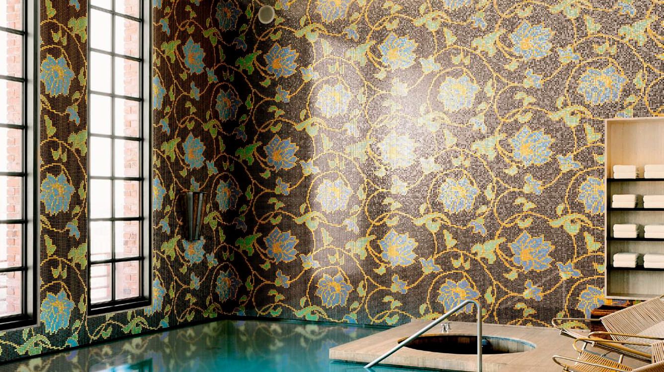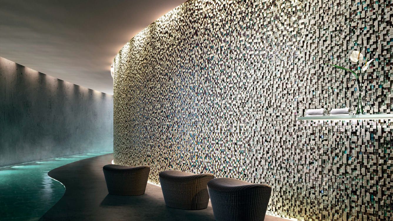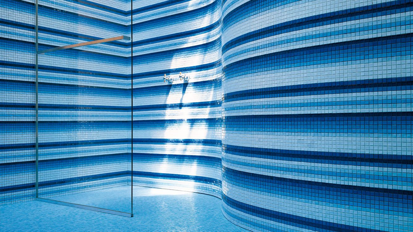 Компания Sicis занималась художественным оформлением великолепного бассейна в клубе Amstel Health в Амстердаме. Мозаика играет всеми оттенками от синевато-стального до бирюзового и перламутрового.