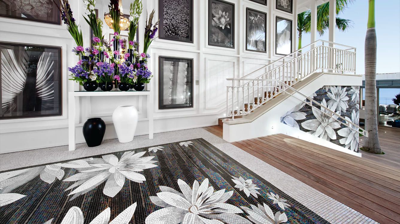 Интерпретация культурного наследия Версаче, ее дизайна и искусства художественного оформления резиденции прослеживается в каждой отдельной детали продукции, мастерски сочетается с архитектурой и умением итальянского дизайнера создавать обстановку с абсолютно уникальной атмосферой. На компанию Sicis была целиком возложена миссия по украшению ванных комнат, номеров-люкс на 4 персоны и бассейна.